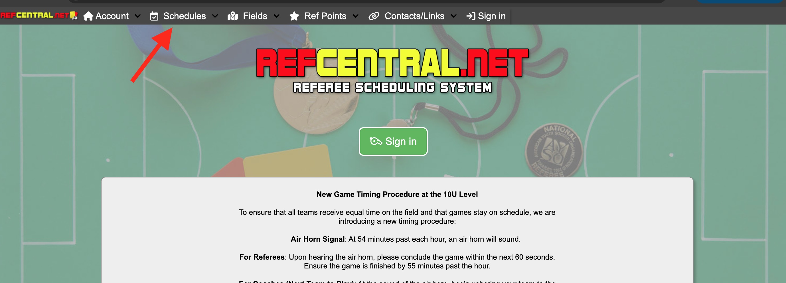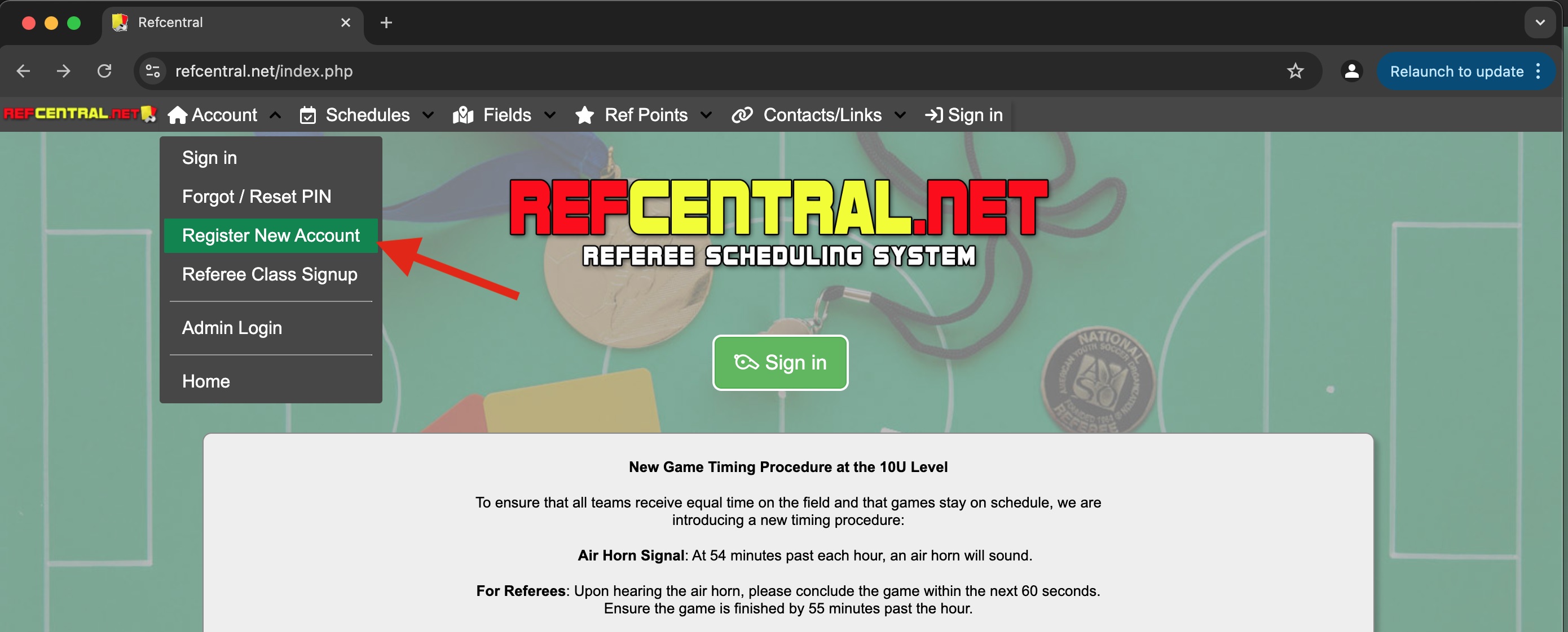 Open a Ref Central AccountRegion 19 uses Ref Central, a referee self scheduling system. Navigate to