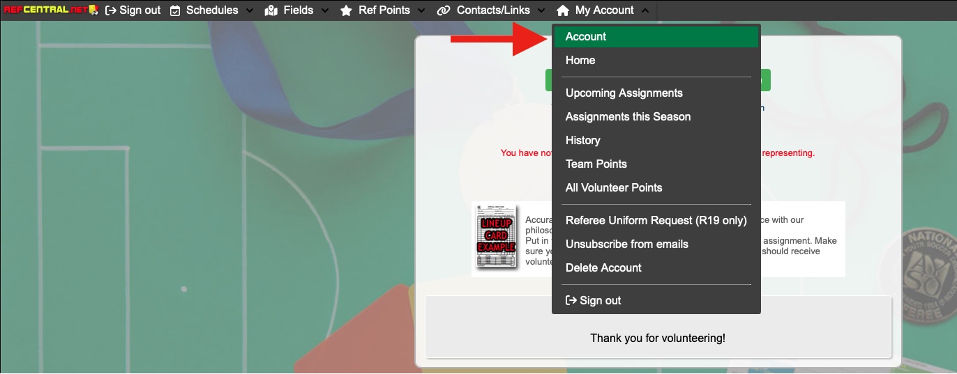 Referee points are important if your team is going to advance to the playoffs. To make sure your team/coach is getting the points you earn on the field, click on "My Account" on the top of the page and select "Account" from the drop down menu.