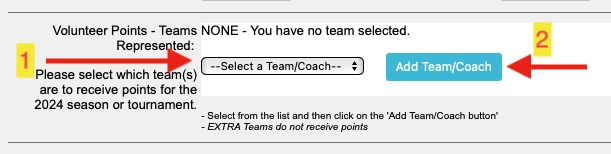 1) Find the Team/Coach from the drop down menu and 2) Click Add Team/Coach. (Please make sure you add the Team/Coach or your team will not get the referee points)