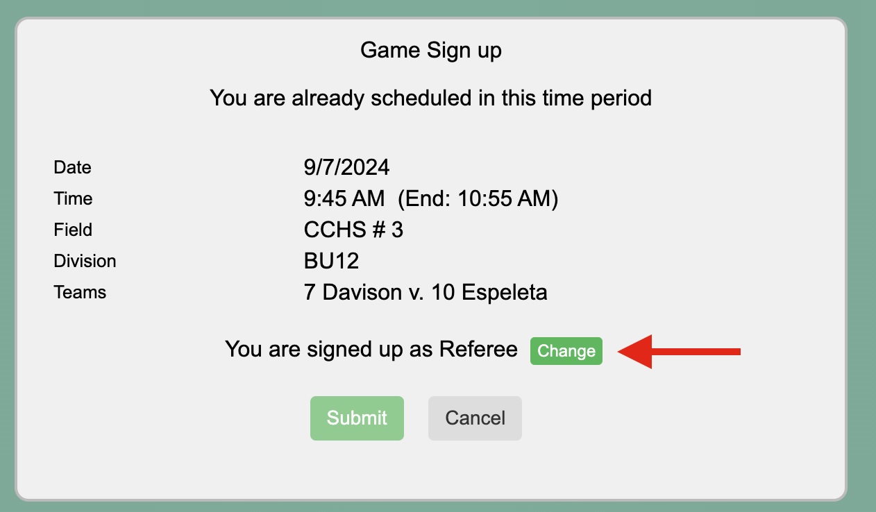 If you accidently signed up for the wrong game on the schedule, need to change to a different game, or you cannot referee the game because something came up, an admin will help with your change request.