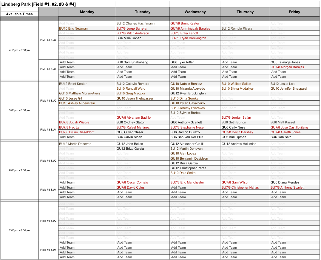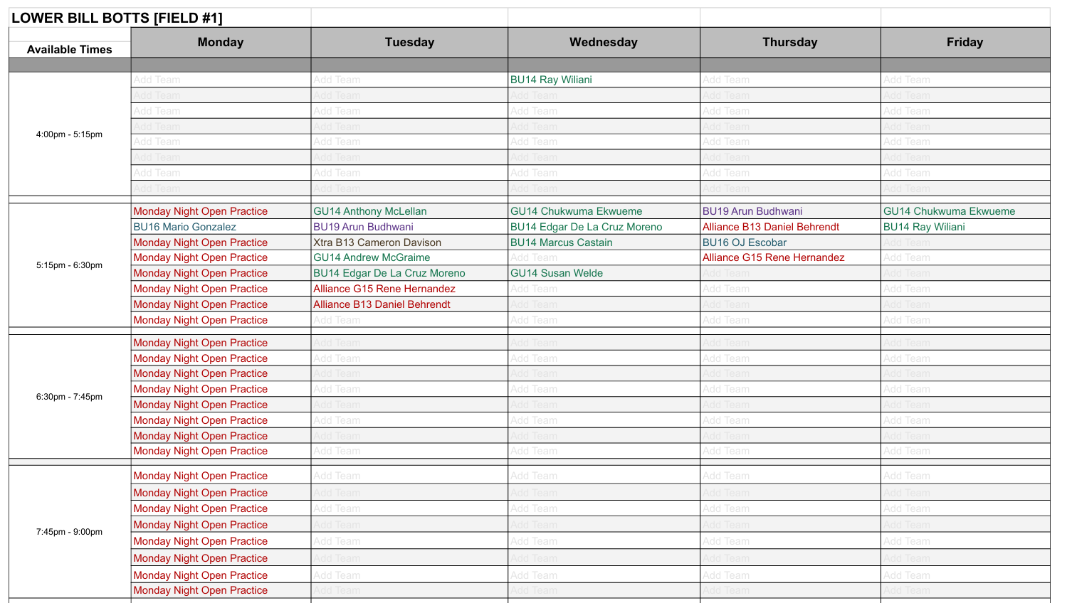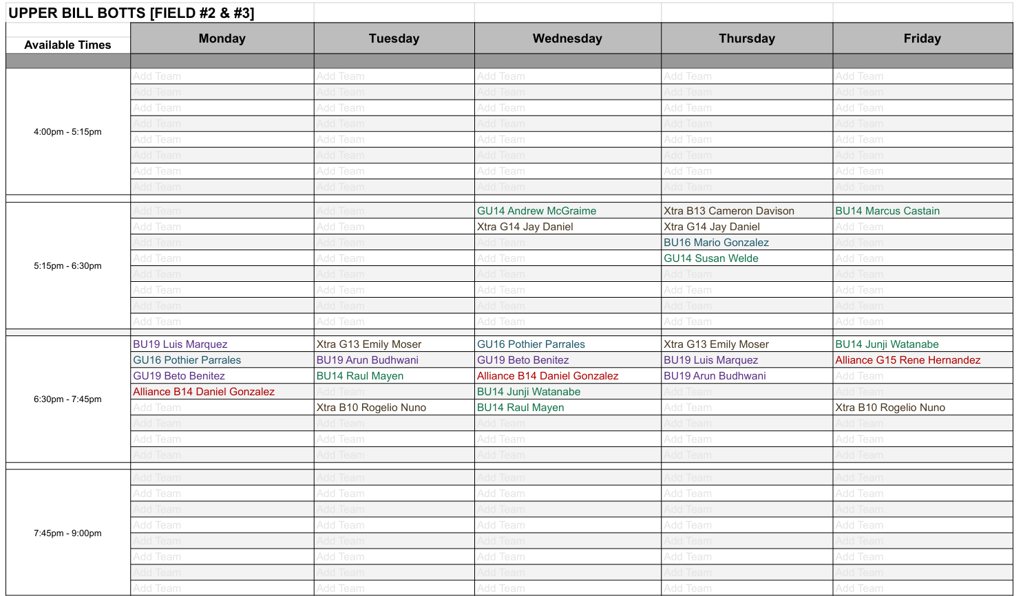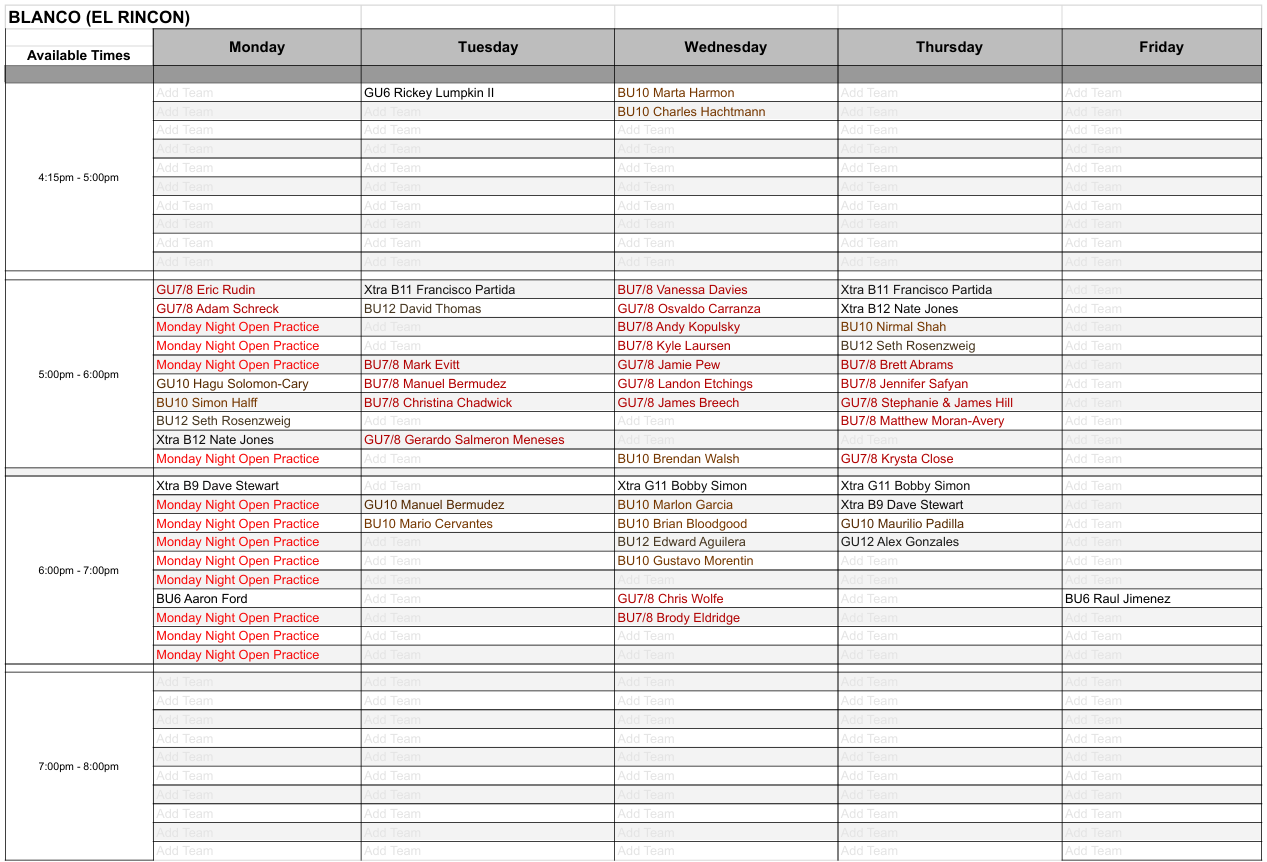 Field Practice Schedule for Bill Botts, Lindberg & Blanco (El Rincon)Updated 10/07/25